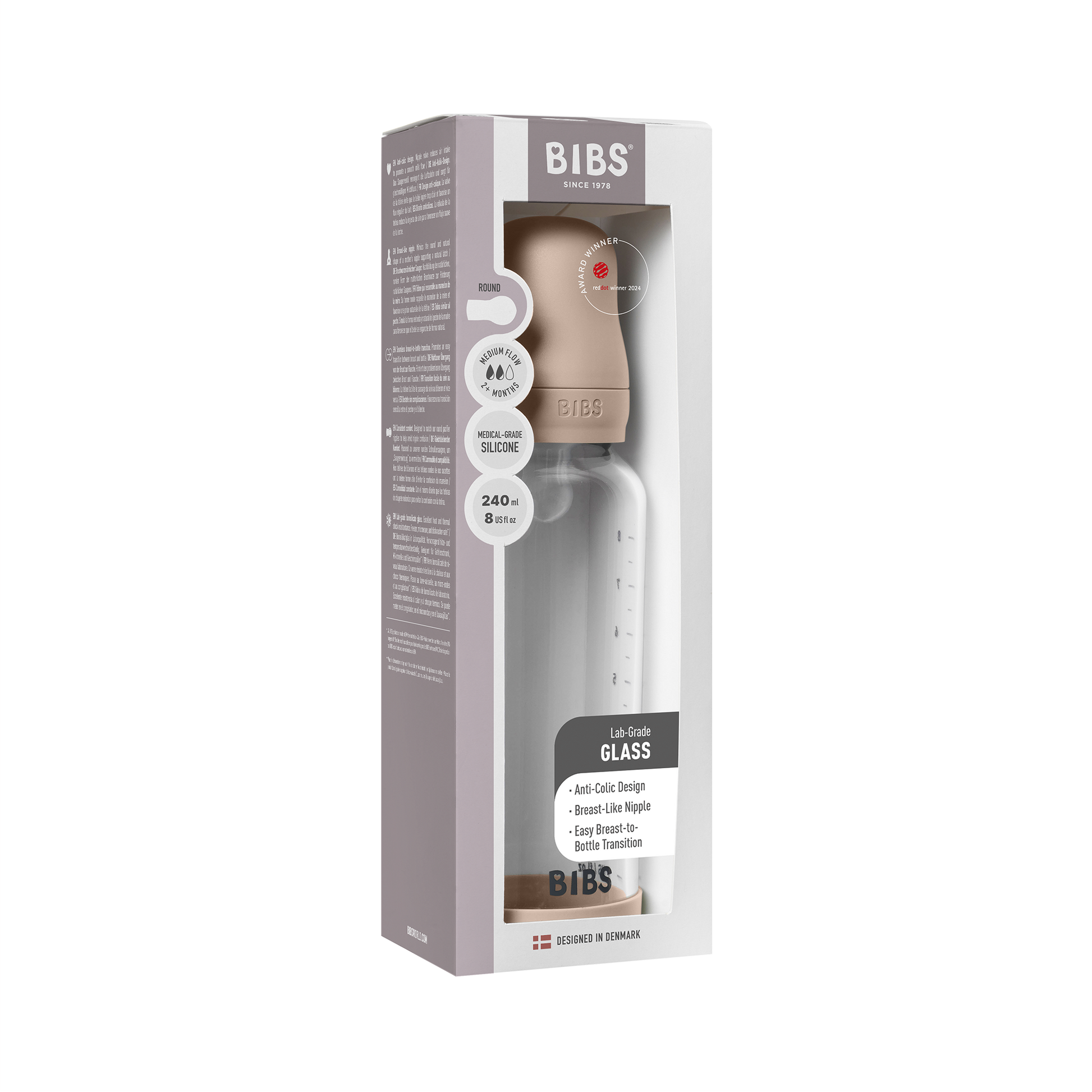 Bibs Baby Glass Bottle Round Silicone Medium Flow (Colour: Blush | Size: 240ml)