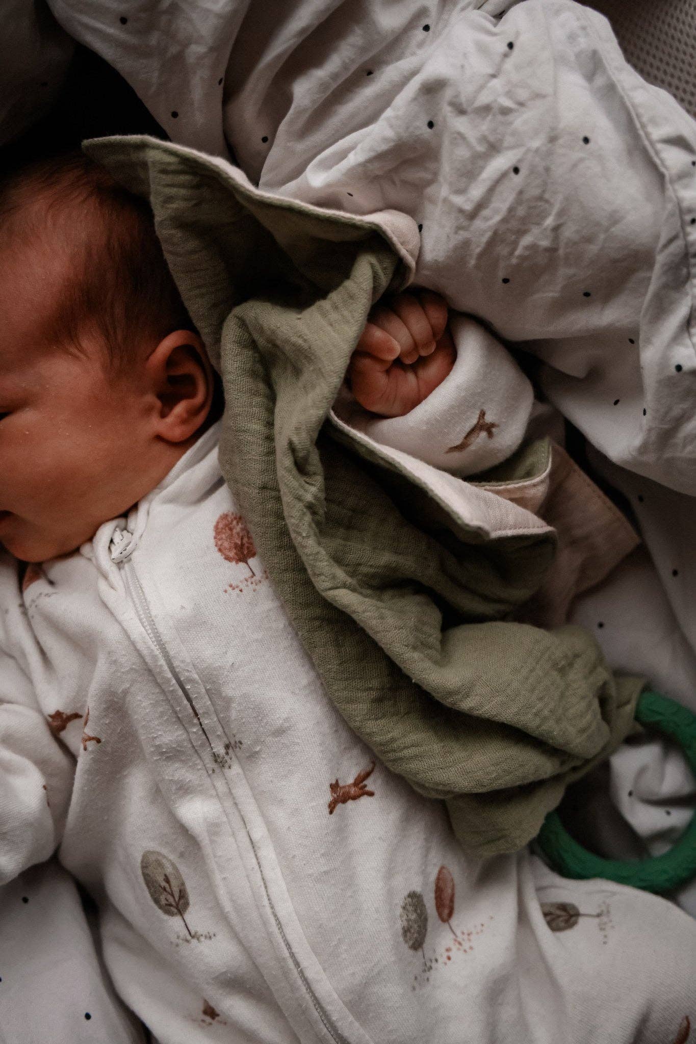 Organic muslin cotton combined with soft, flexible natural rubber ring with leaf textured pattern will comfort your little one and help aching gums.