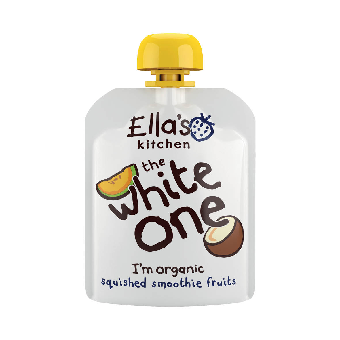 Ella’s Kitchen Smoothies 6M+ The White One: 100% organic squished fruits packed with apples, bananas, coconut milk, pineapples, melon juice + dash of lemon juice. I’m a handy smoothie fruit snack with nothing else added, not even water.