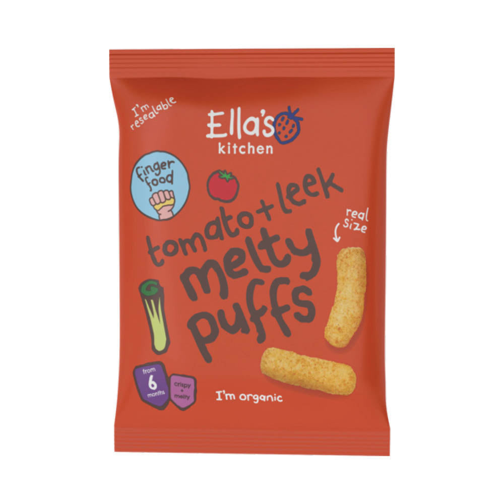 Ella’s Kitchen Stage 1 6M+ Tomato & Leeks Melty Puffs: organic tomato + leek maize puffs.