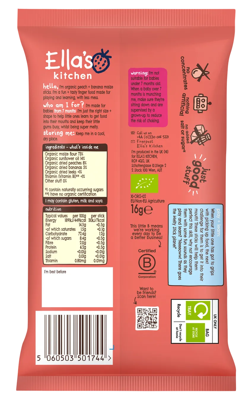 Hello, I'm organic peach + banana maize sticks. I'm a fun + tasty finger food made for playing and learning, with less mess.