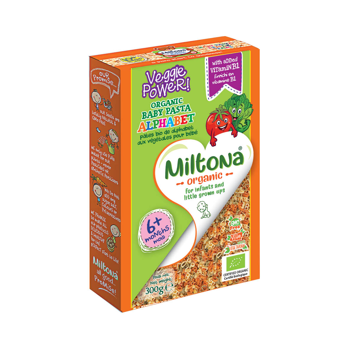 Miltona Organic Baby Pasta Veggie Alphabet is made from simple, wholesome ingredients and is suitable for infants from 12 months onward. Fortified with Vitamins B1.