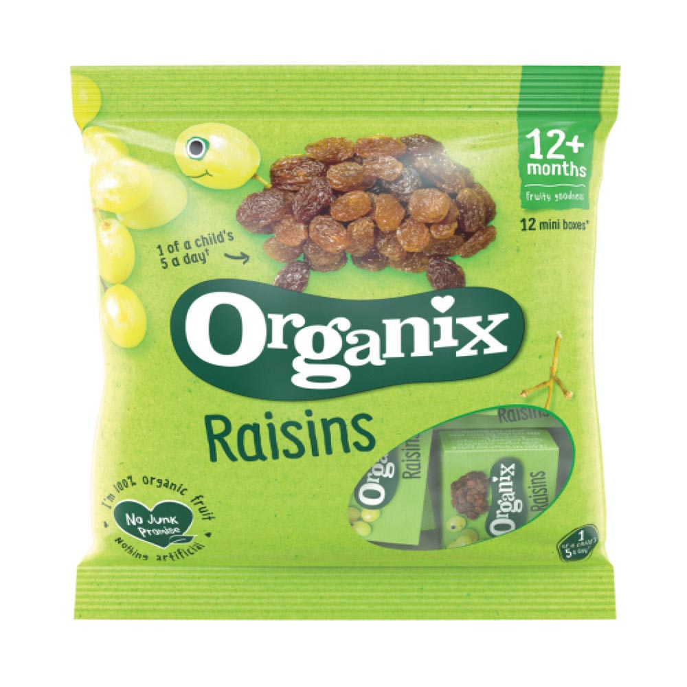 Organix juicy Raisins are perfectly portioned into handy little boxes for budding explorers on the go. Full of fruity goodness, they’re 1 of your little one’s 5 a day too.