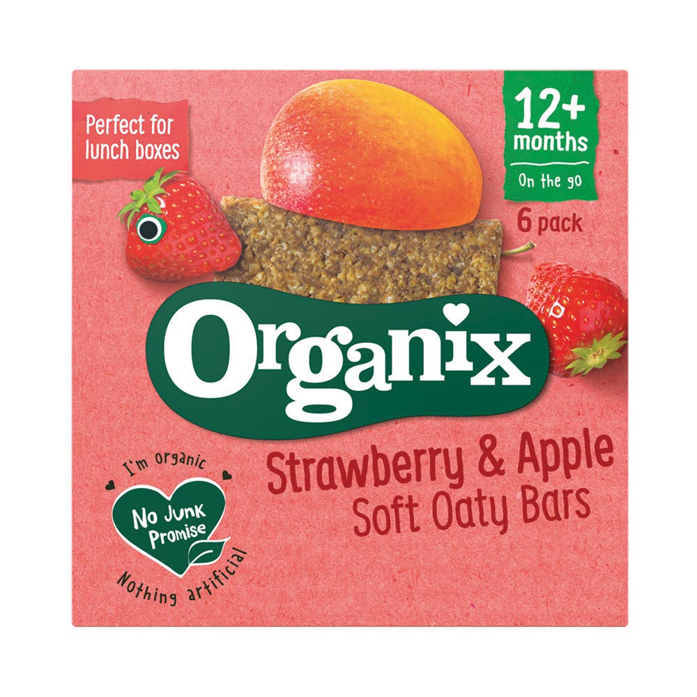 Soft, scrummy and deliciously fruity, Organix organic Strawberry & Apple Soft Oaty Bars are packed full of real fruit pieces, juicy raisins and wholegrain oats for toddlers on the go.