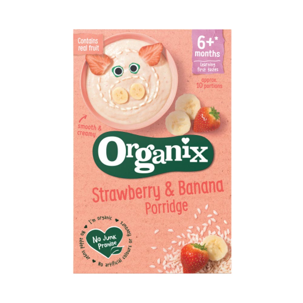 Organix organic strawberry and banana rice porridge for babies is made with real fruit. The delicious flavour comes from the strawberry and banana, with no added sugar, artificial flavours or sweeteners, and that’s a promise!
