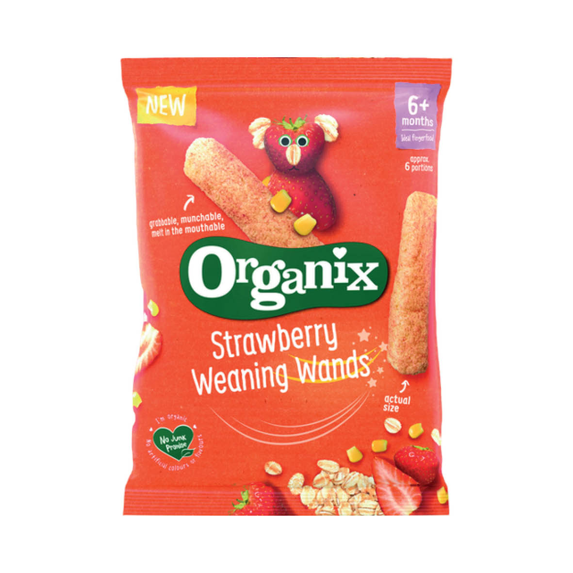 Delight little learners with Organix Strawberry Weaning Wands! Made simply from corn & oats and coated with strawberry, they’re gently baked into chunky sticks that are easy to grab, hold and happily munch. Perfectly sized for little fingers they make a delicious first finger food. Plus they melt in the mouth too.