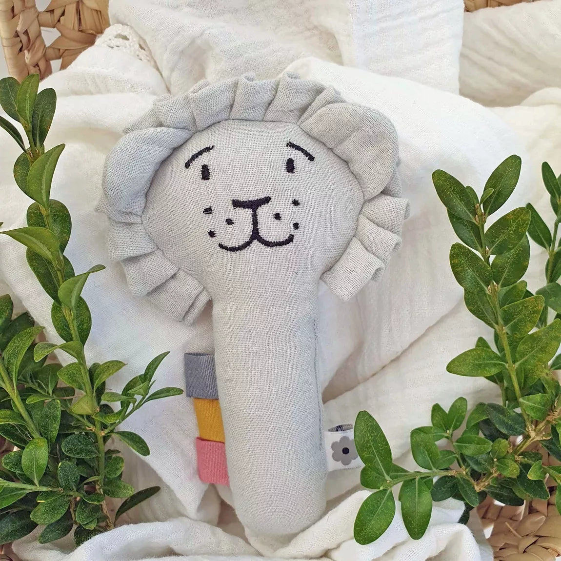 Soft rattle lion in organic cotton muslin.